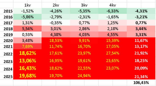 Presunieme sa za oceán, nasleduje Kanada – krajina, ktorú radím medzi top 2 krajiny, ktoré svojich občanov buzerovali najviac a čuduj sa svete … patria medzi najmenej úspešné (stres asi fakt nie je dobrá vec). Na pomyselnom rebríčku obdobia 2020-2025 suverénne posledné (s trojciferným výsledkom) a v rebríčku 2023-2025 tiež s tým, že zatiaľ čo v tom prvom posledného „tromfli“ o 9,6%, v druhom o 14,9%.