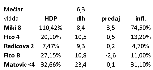 Dal som základné makroekonomické ukazovatele HDP za dané obdobie, dlh v mld. EUR za dané obdobie, infláciu za dané obdobie a aj predaj, tj. v akej hodnote bol predaný štátny majetok. Predaj s (-) je vlastne kúpa, v tom jedinom prípade to bolo SPP. O túto sumu sa zvýšila zadĺženosť, ale súčasne štát získal nejakú hodnotu.
