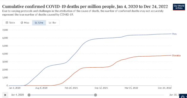 … pre zmenu štát, ktorý podľa médií doby temna dopadol najhoršie. Podľa https://ourworldindata.org/covid-vaccinations porovnanie Slovenska a Peru vyzerá takto (údaje sú len ku koncu 2022, nie žeby neboli aj ďalej, ale v roku 2023 boli tie prírastky malé – aspoň na grafe, Peru 6516 vs. Slovensko 3804 na mil. obyvateľov a umiestnenie oboch krajín v tomto rebríču bolo svetová 1. a 12.)