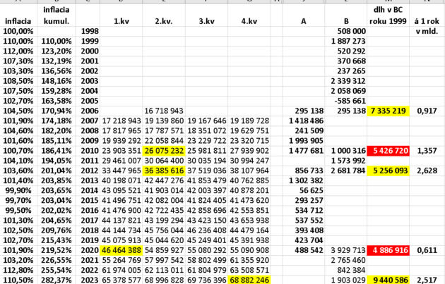 Desiaty stĺpec je sumárom dlhu za obdobie tej ktorej partie (červené sú smerácke) – prepočítané na stále ceny.