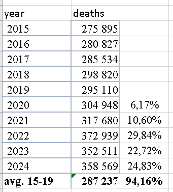 Čo sa týka úmrtí v rokoch 2023-2024 dokázali tromfnúť na nadúmrtia aj najhoršiu európsku krajinu – aj keď len o málo, ale za dva roky a nie tri ako majú európania celkom slúšný výkon nie?