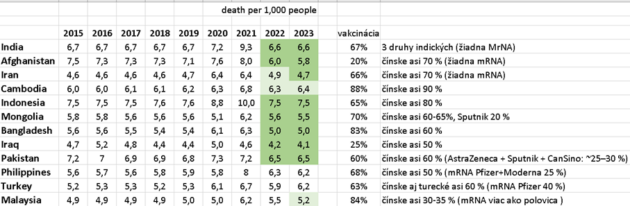 Pre roky 2022 a 2023 (volajme ich postvakcinačné) platí, že ak je hodnota roku podfarbená tmavšou zelenou farbou, tak úmrtia v tom roku boli nižšie maximálne rovné úmrtiam pred rokom 2020. Ak bola farba svetlo zelená, tak úmrtia boli mierne vyššie, ako tie pred rokom 2020. Bielou sú roky, kedy tie čísla boli vyššie … a čuduj sa svete patria tam krajiny s povšimnutiahodným podielom mRNA.